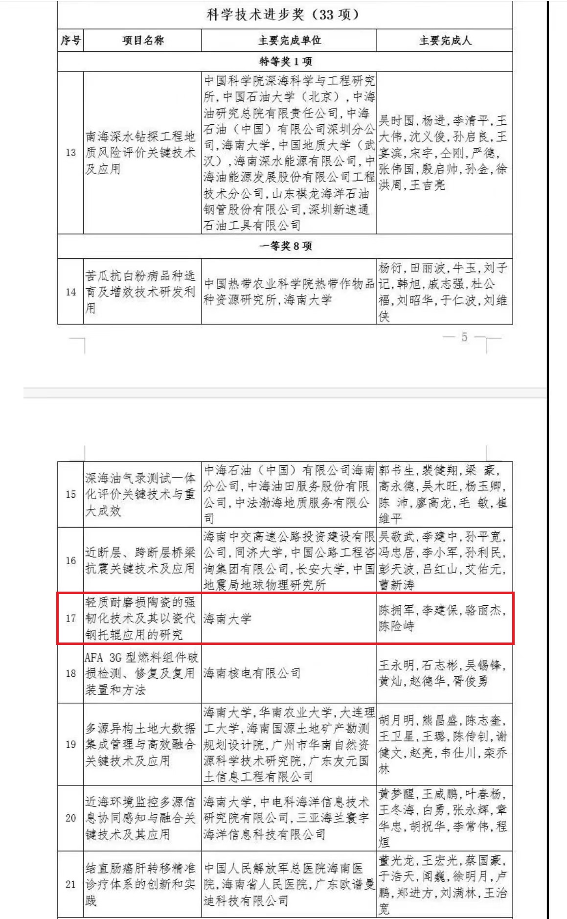 11月30日,海南省发布关于2020年度海南省科学技术奖励的决定,公布47项荣获2020年度海南省科学技术奖的成果,对海南省科学技术进步、经济社会发展作出突出贡献的科学技术人员和组织给予奖励。公司陈拥军教授、骆丽杰副教授荣获2020年海南省科学技术进步奖一等奖,并作为获奖代表发言。